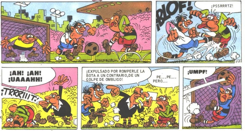 Me acuerdo de como sigue: le pita penalty al portero por agarrar el balón con las manos, este protesta diciendo que es el portero y el árbitro le responde que «a él no le venga con problemáticas sociales» o algo así.