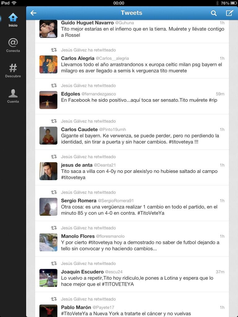 Joder, pero lo de desearle la muerte al pobre Villanova es algo extremista. Yo creo que el cambio de Villa en el minuto 85 y con 4-0 lo realizó en el momento justo, cuando la defensa bávara estaba más agotada, y cuando más daño les podía hacer el guaje al tirar sus diagonales con Hernández y Catarbón.